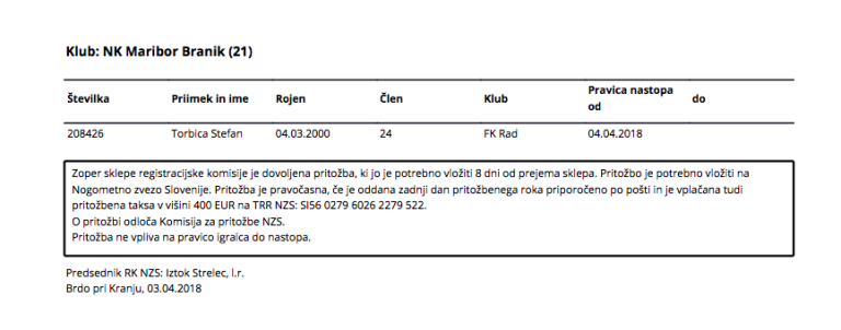 Po podatkih razvidnih iz spletni strani Nogometne zveze Slovenije imajo vijoličasti v svojih vrstah novega nogometaša. Pogodbo z Nogometnim klubom Maribor je podpisal 18-letni nogometaš iz Srbije Stefan Torbica, zaigral bo za mladince.