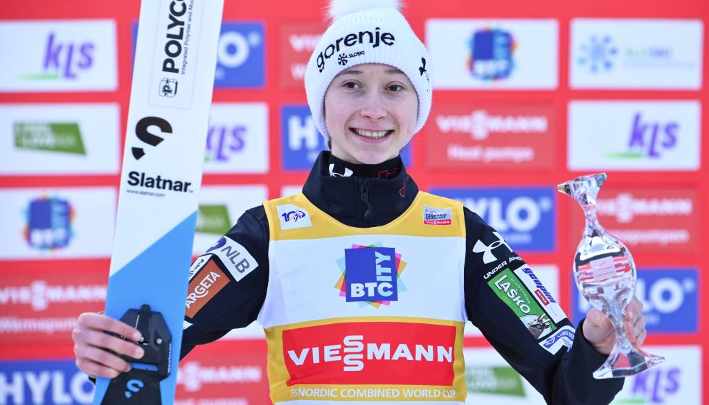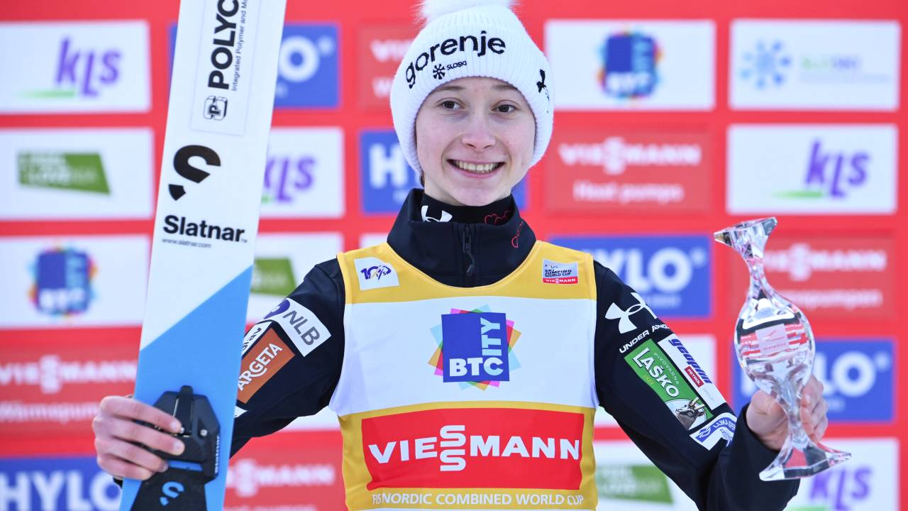Nika Prevc se veseli nove zmage. Vodilna skakalka svetovnega pokala je zdaj s šestimi zmagami najuspešnejša Slovenka, uspeh domačih skakalk pa je s tretjim mestom dopolnila še Nika Križnar.