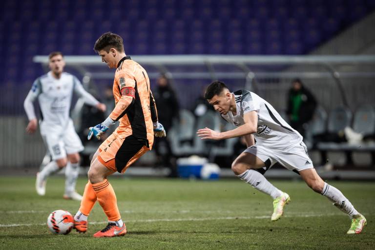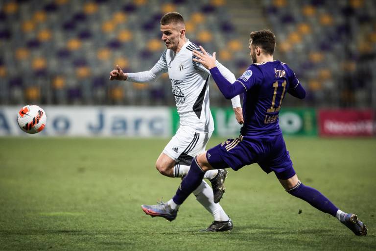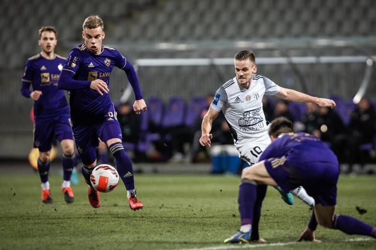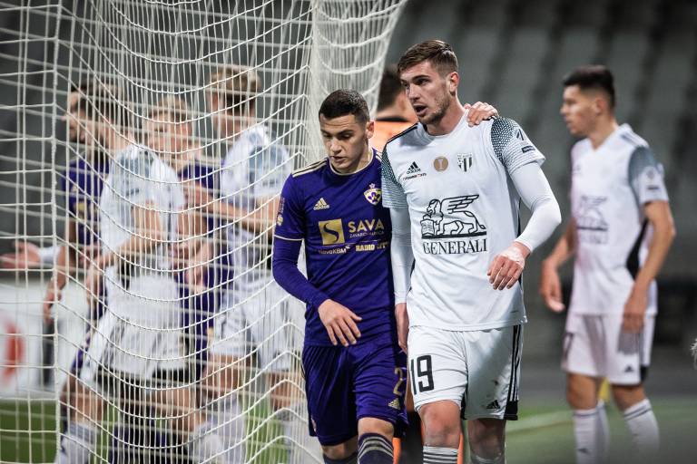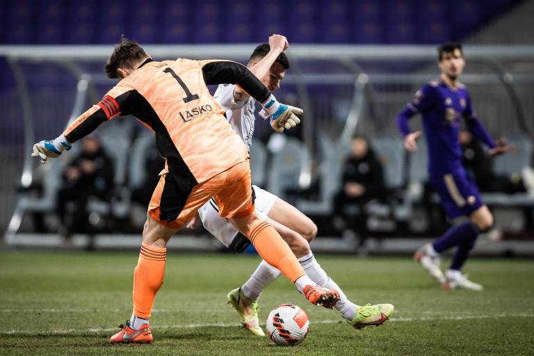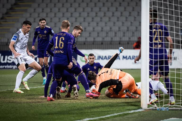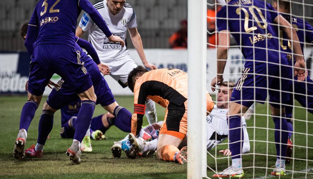 10' Gregor Sikošek s prodorom po levi strani in s povratno podajo v sredino, Jan Gorenc je v zadnjem trenutku izbil pred Mudrinskim.