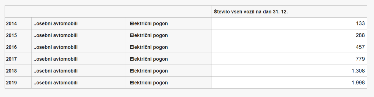 Število električnih osebnih avtomobilov se je v letu 2019 glede na 2018 povečalo za 53 odstotkov in je doseglo skoraj 2.000.