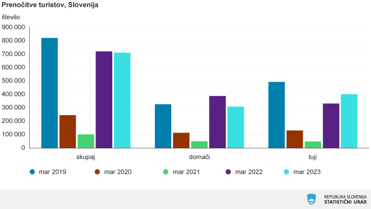 Kot je razvidno iz najnovejših podatkov Statističnega urada Republike Slovenije, so v turističnih nastanitvenih obratih po Sloveniji v mesecu marcu skupno našteli 277.000 prihodov turistov in 715.000 njihovih prenočitev.