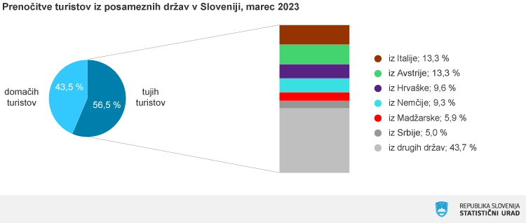 Ustvarili so približno 404.000 prenočitev oziroma za 21 odstotkov več kot lani, kar pomeni, da so tuji turisti prispevali kar 57 odstotkov vseh prenočitev v mesecu marcu. Največkrat so prenočili v občinah Ljubljana, Piran in Kranjska Gora, navaja statistični urad.