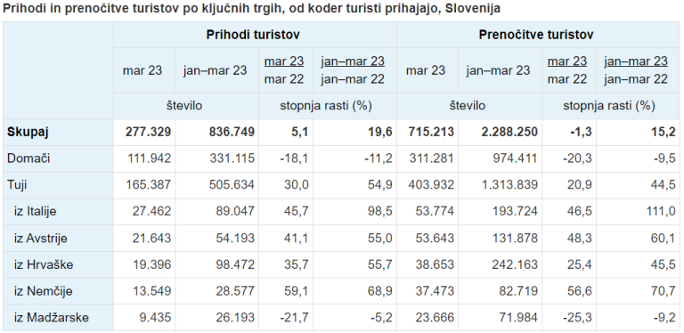 Da si je slovenski turizem po epidemiji koronavirusa dodobra opomogel, je več kot razvidno iz tega, da je bilo skupno od začetka januarja do konca marca v Sloveniji zabeleženih kar 837.000 prihodov turistov in skoraj 2,3 milijona njihovih prenočitev.