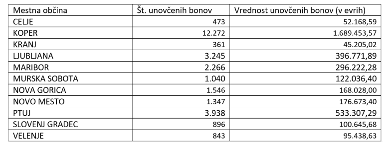 Najbolj oblegana je piranska občina, kjer je bilo unovčenih že 63.899 bonov v vrednosti 9,8 milijonov evrov. Sledita občini Kranjska gora in Bohinj, kjer je bilo doslej unovčenih za 3,4 oziroma 2,8 milijona evrov bonov.