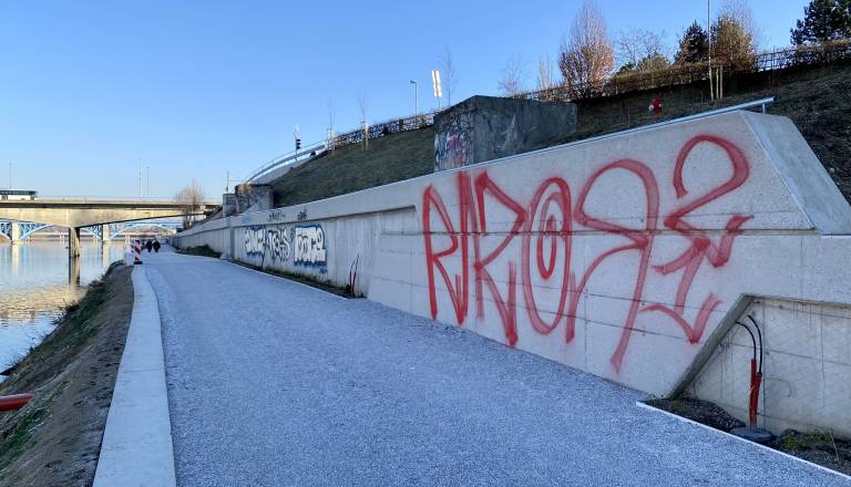 FOTO: Vandali nad betonski zid ob kolesarski progi, občina s pranjem zidu neuspešna
