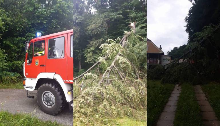 Močan veter podiral drevesa in odkrival strehe, prevrnilo se je gasilsko vozilo