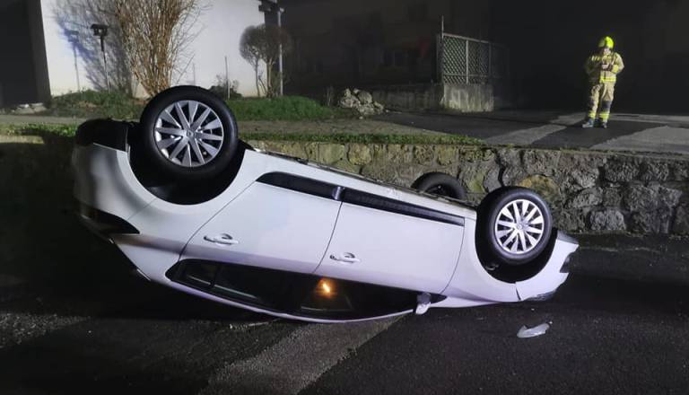Huda nesreča v Miklavžu: Voznik v ovinku zapeljal s ceste, z avtom pristal na strehi in se huje poškodoval