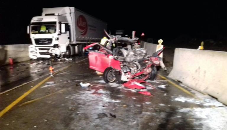 Trčil v betonsko ograjo, nato je pripeljal tovornjak ... Sopotnica v bolnišnici umrla