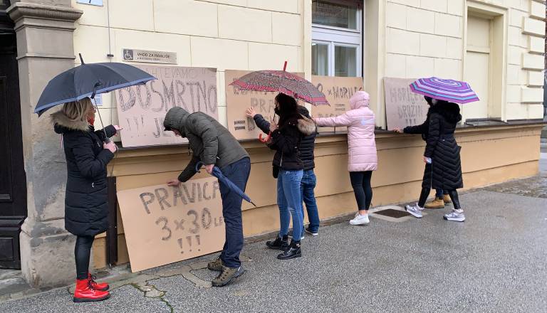 FOTO in VIDEO: Znanci umorjenih pred sodiščem s transparenti, za Drevenška zahtevajo dosmrtno kazen