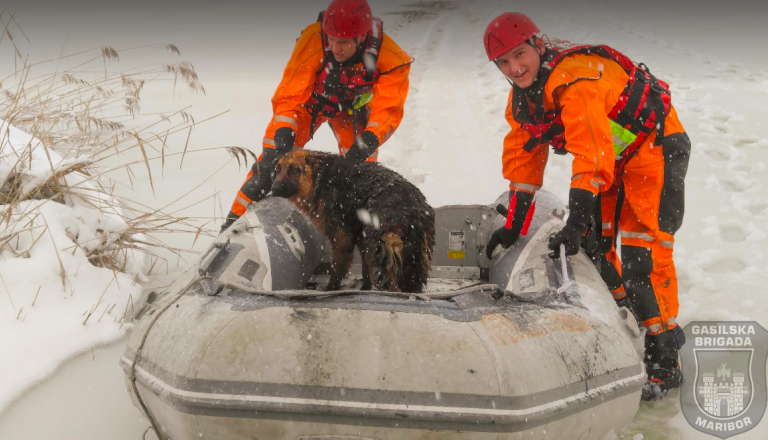 FOTO: Mariborski gasilci iz jezera rešili psičko Luno, ki se ji je pod nogami vdrl led