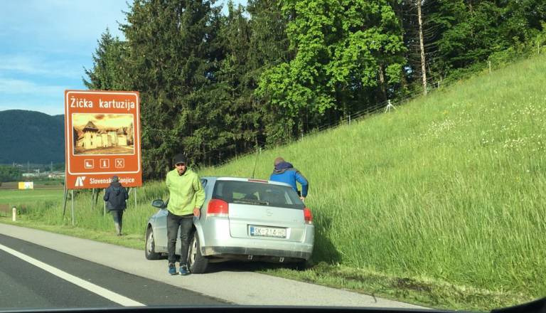 Med predoroma pri Tepanju avto na strehi, polovica avtoceste zaprta več ur