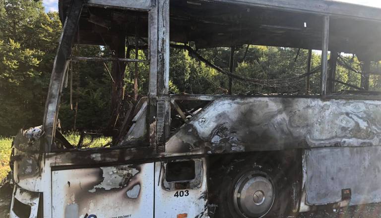 FOTO: Ognjeni zublji zajeli potniški avtobus, ta je pogorel skoraj v celoti
